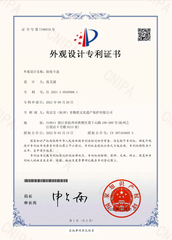 传宗宝(杭州)非物质遗产保护有限公司(以下简称传宗宝)于近日收到国家知识产权局颁发的一项外观设计专利证书。本外观设计已经经过中华人民共和国国家知识产权局进行审查,授予专利权,并在专利登记簿上予以登记,此专利权现已生效。